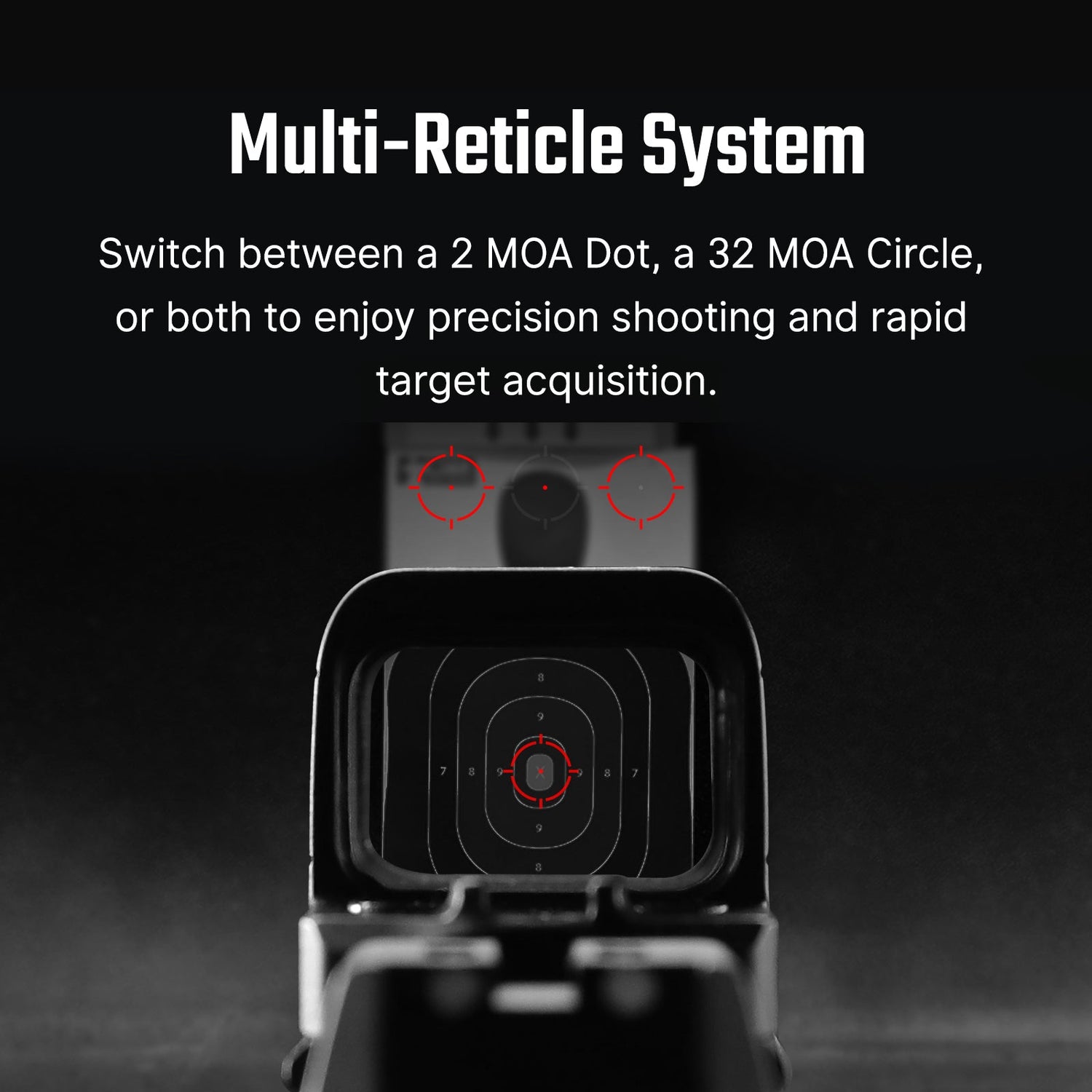 2 MOA punkt ja 32 MOA ring: vali punkti ja ringi, ainult punkti või ainult ringi sihtimismärgi vahel igasugusteks laskmissituatsioonideks, et saada terav ja ere sihtimislahendus.