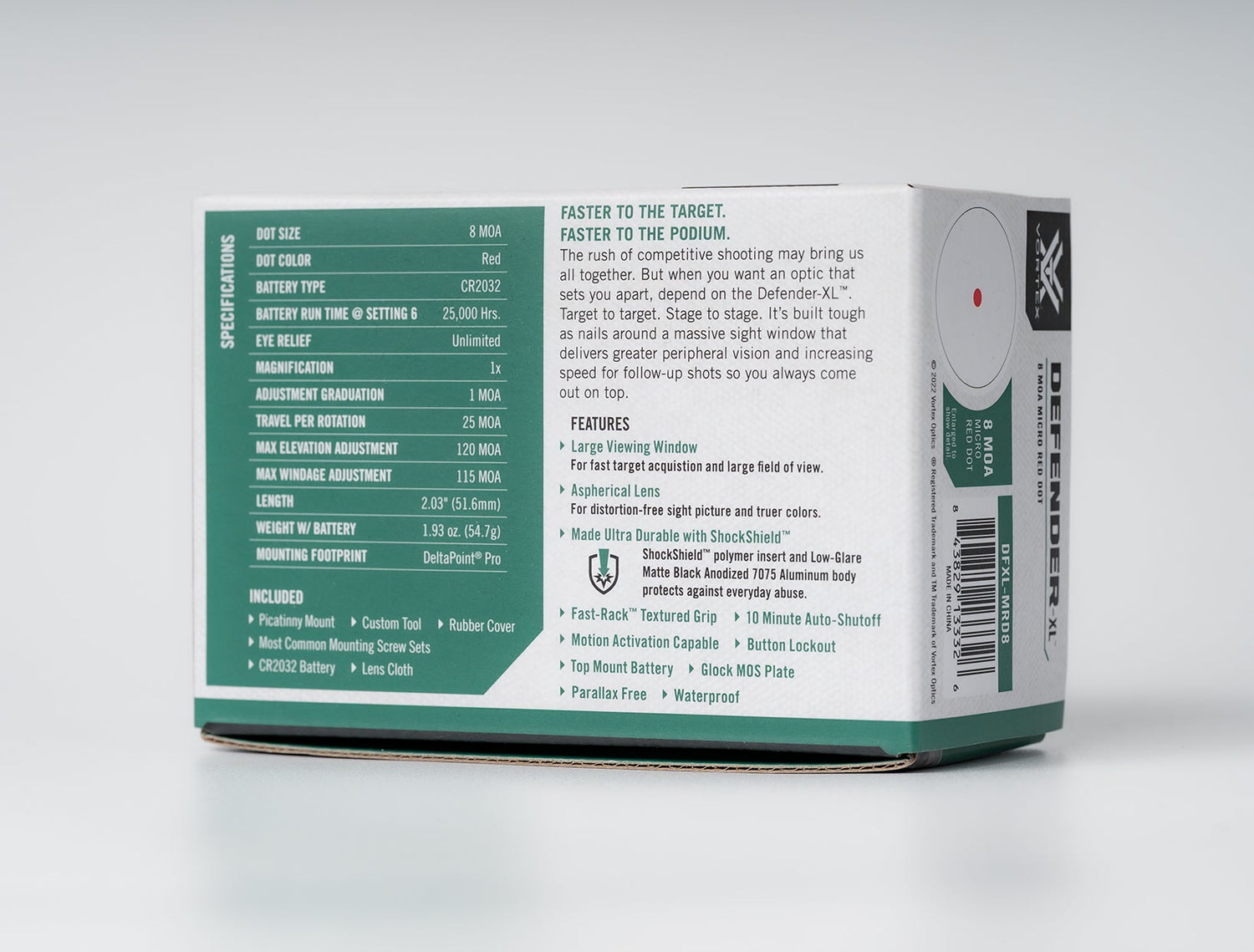 Ehitatud ülilairiba sihikakna ümber, et võimaldada kiiremaid sihtmärkide vahetusi, on Defender-XL vastupidav, võistluskõlbulik mikro punatäppsihik, mis sobib suurepäraselt ka teenistus- või lasketiiru püstolitele — ning karabiinidele/haavlitele, kui kasutada kaasasolevat Picatinny siini kinnitust.